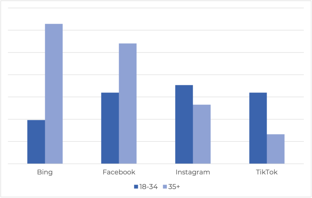 On the other hand, social media platforms play a more substantial role for the 18-34 age group, while older consumers rely more heavily on established search engines like Google and Bing.