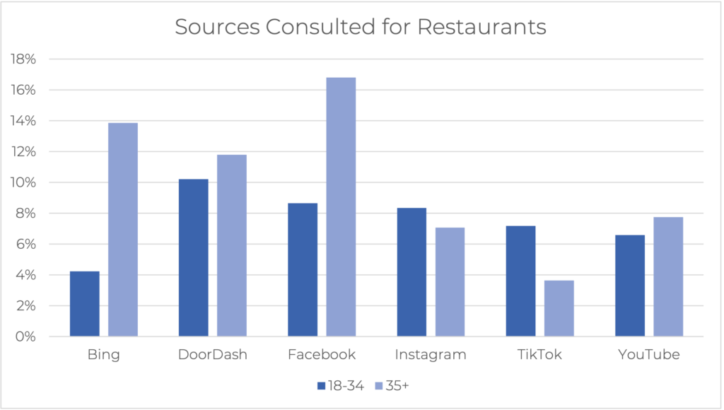 - Visual platforms are among the top sources consulted for Restaurants. 3/6 top sources for each age group are social media platforms heavily reliant on visuals, such as YouTube and Instagram. This highlights the significance of visual content in the restaurant discovery process.