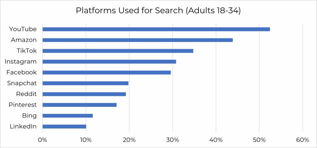 Google is the dominant search engine in the U.S., but “search” behavior has become much bigger than the volume in a search engine alone. Social and commerce platforms’ search features are very popular and powerful business tools. Depending on the category, there is more “search” behavior happening outside of Google than inside of Google.
