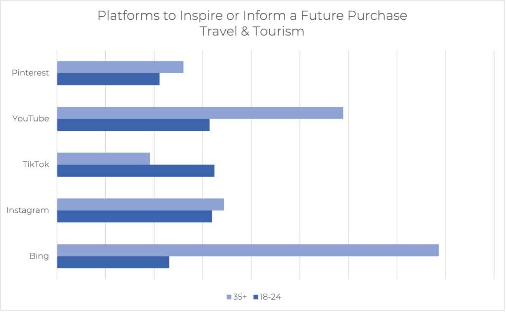 - Pinterest exhibited a 23% surge in popularity among the 35+ age group compared to the 18-24 demographic. This suggests that Pinterest is swiftly becoming a favored platform for travel-related searches among those 35+ consumers, presenting a prime opportunity for the platform to tailor its travel-related content to this demographic.