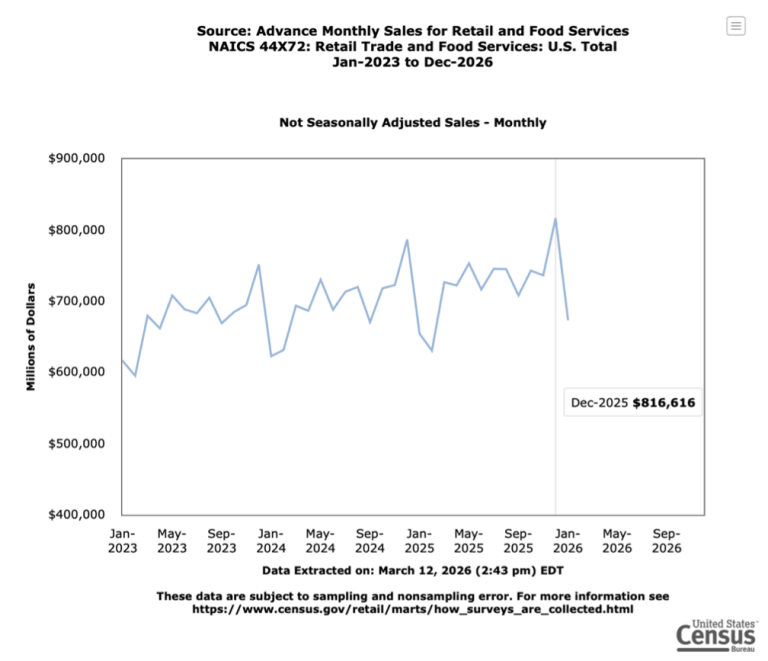 While seasonally adjusted month-to-month data looked flat, non-seasonally adjusted data tells a different story: consumers spent $736 billion in November and $817 billion in December of 2025. That’s an $80 billion dollar increase in retail sales. That translates to 11% holiday growth, up from 9% in 2024, and the trend holds even when 2024 sales are adjusted to 2025 dollars.