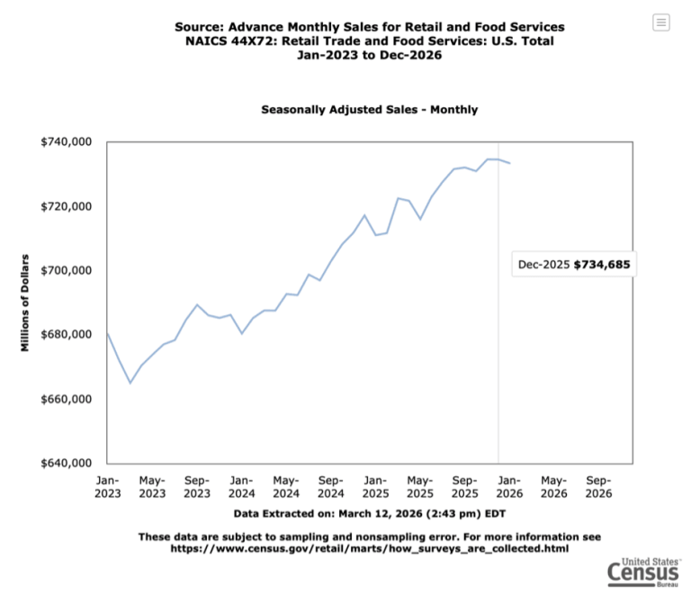 Seasonally adjusted data tells us that consumers spent $735.085 billion in November and $734.967 billion in December of 2025. That’s right, it’s flat. Negative growth month to month if we’re being honest, but keep in mind, we are looking at “smoothed” data and not the actual holiday surge.